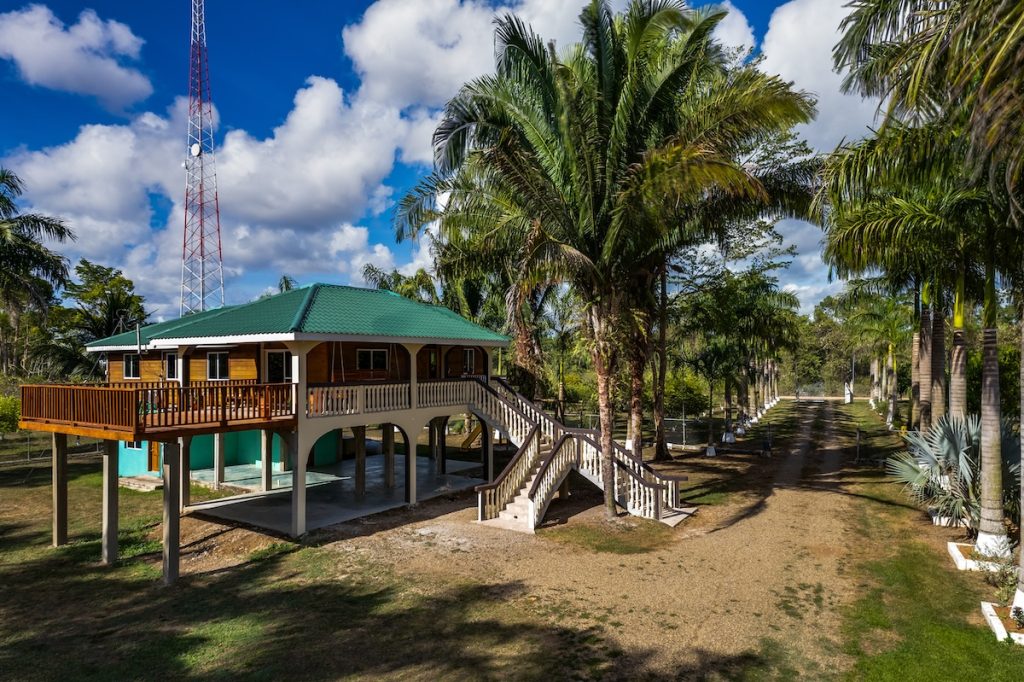 Our two storey luxurious home, and was fully renovated in 2023. It is ideal for a large family or small group looking for a private retreat, with two king-sized and two queen-sized beds. The large living and dining area has a cathedral ceiling. The fully equipped kitchen has an island with beautiful quartz counter tops. We have a ten-person dining room table. The decor throughout our home is accented with Belizean hardwoods, including mahogany, most of it hand made. A sliding door connects the living/dining area to a huge balcony from which you have a marvelous view of a big garden, the fruit farm, the Mayan mountains, and fabulous sunsets.